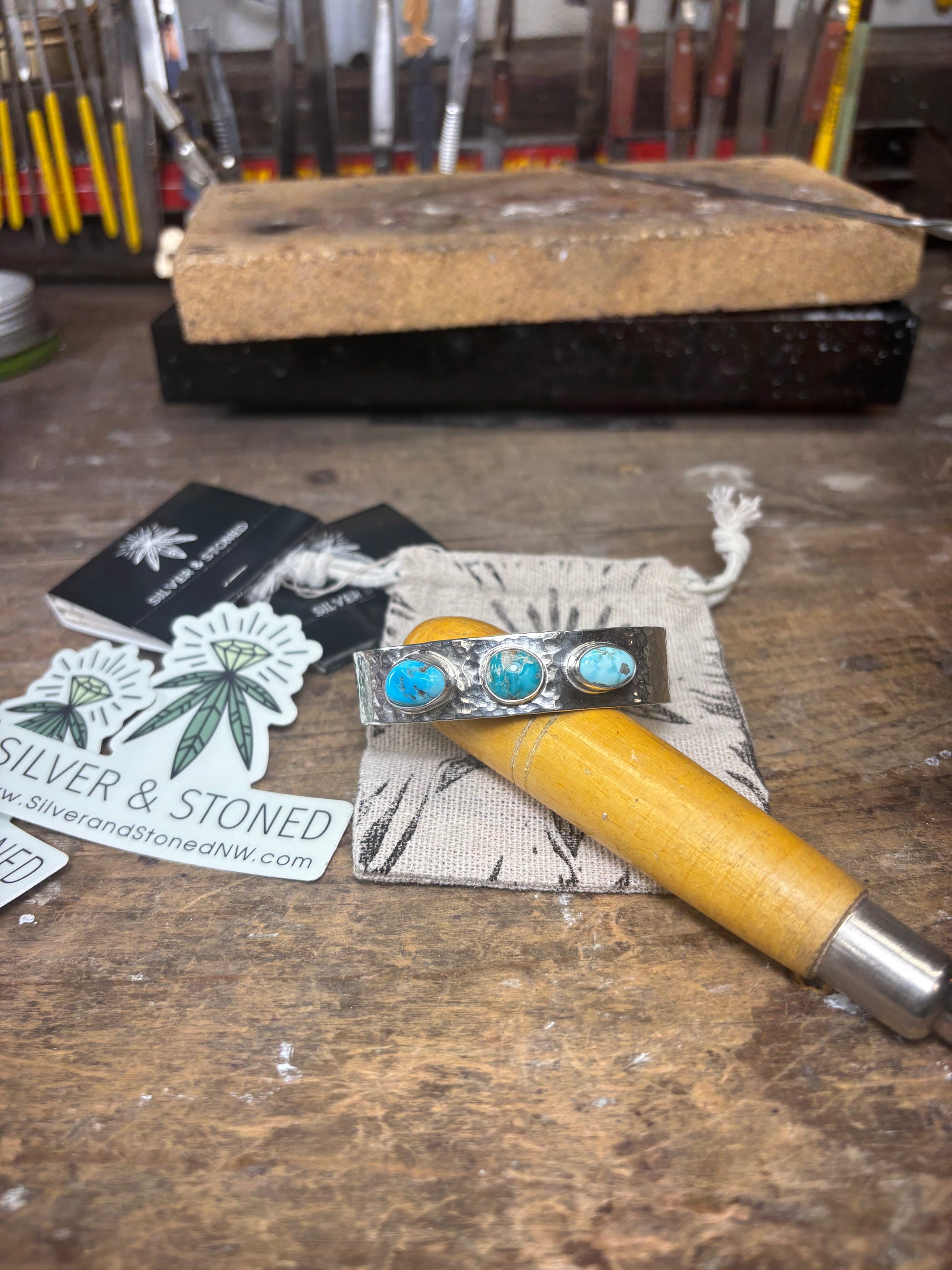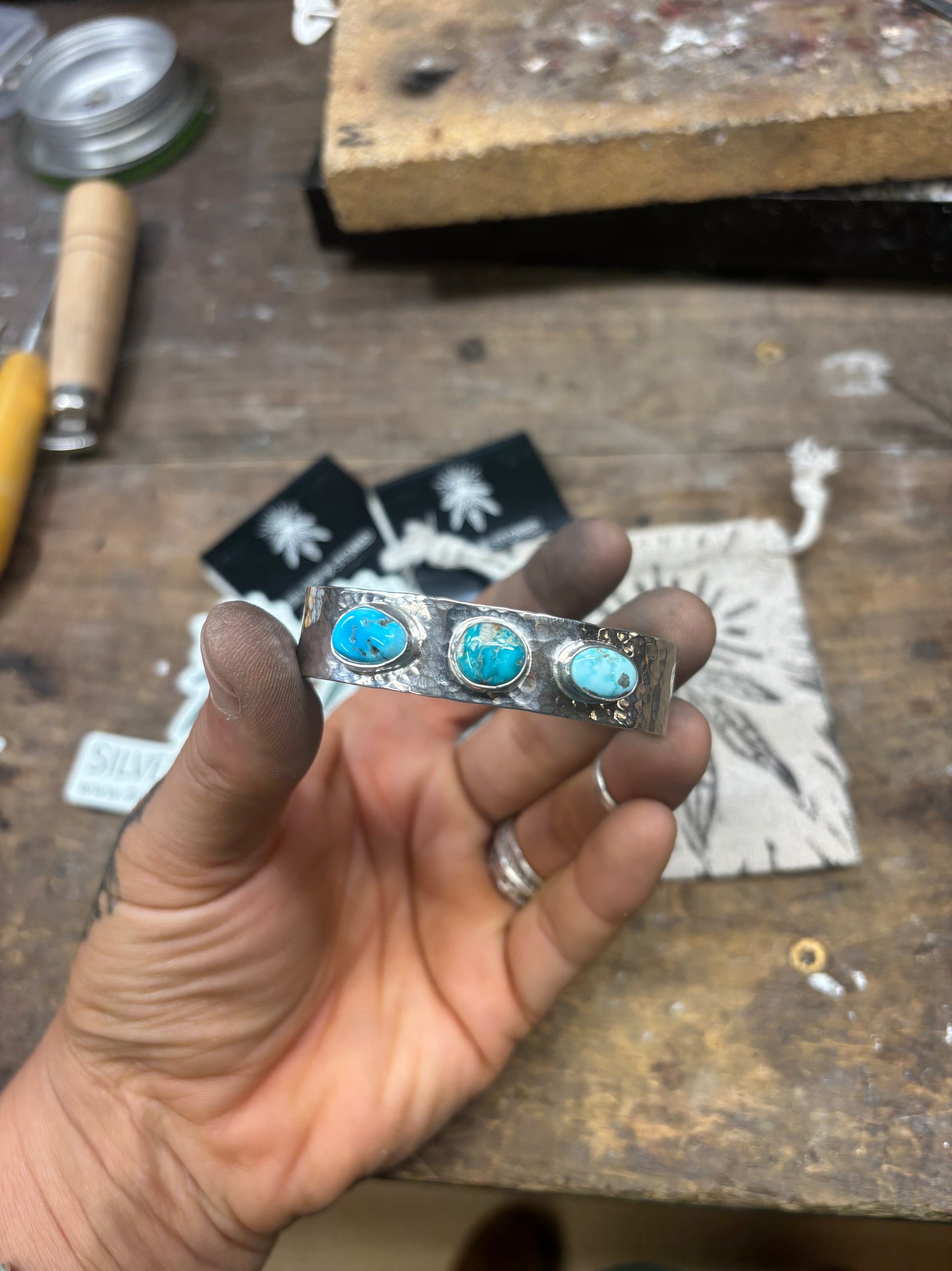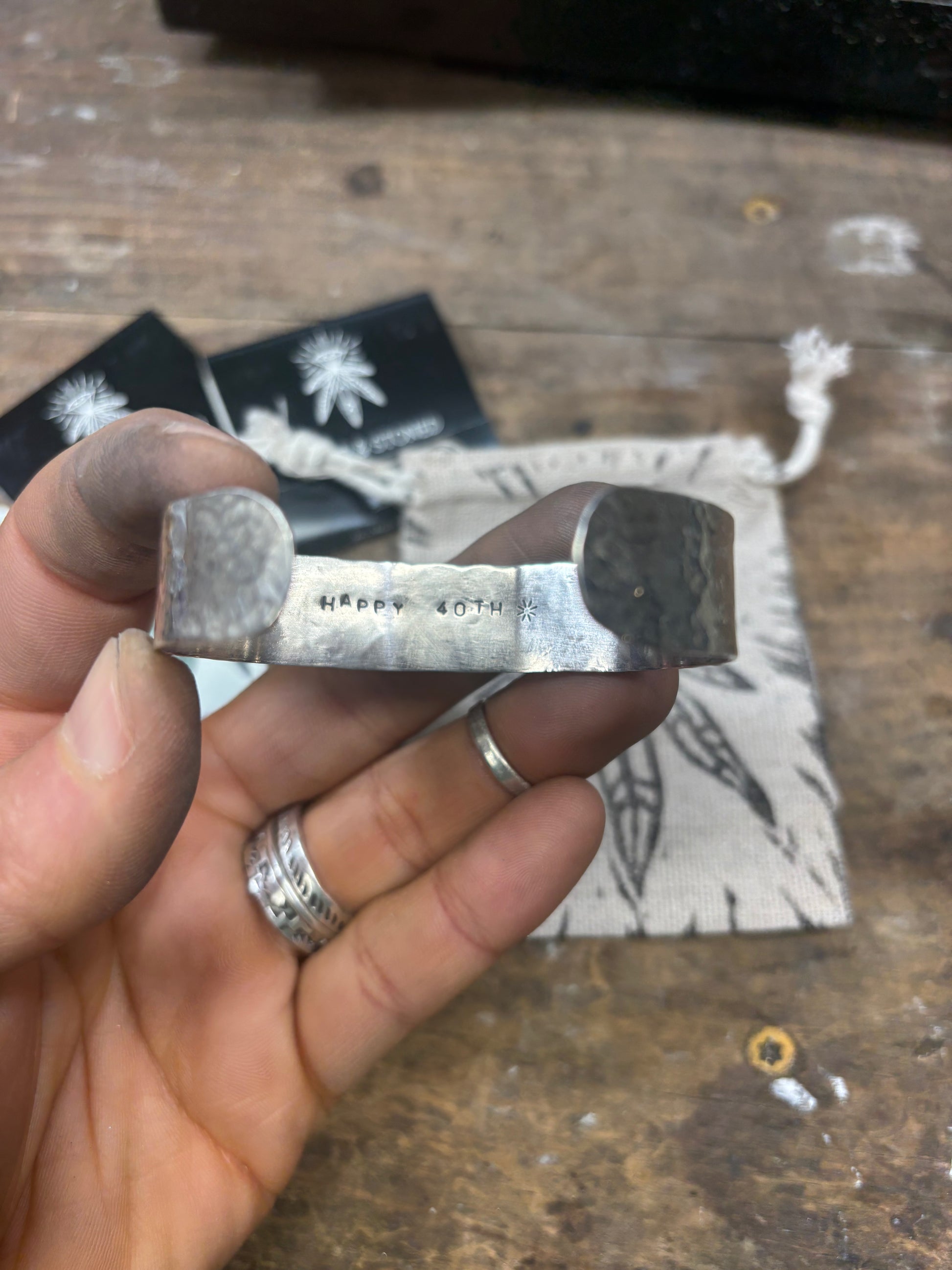 Hammered wide band cuff with 3 turquoise stones set in fine silver bezel. “Happy 40th” custom stamping inside band. Artist signed and marked 925